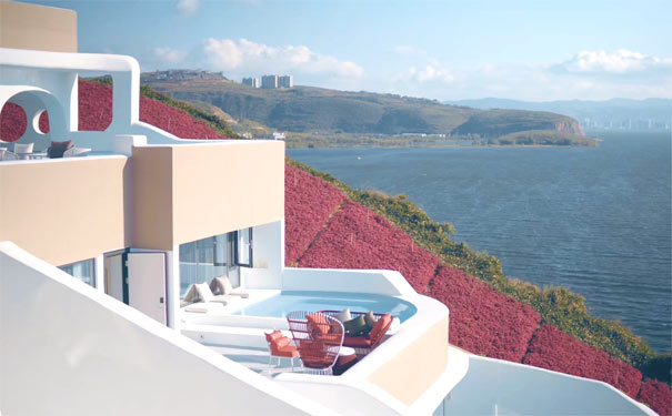 蓝白建筑群复刻希腊风情,悬崖边的咖啡馆与露台是拍照圣地,适合穿纯色长裙打卡。